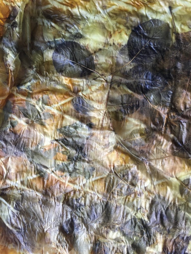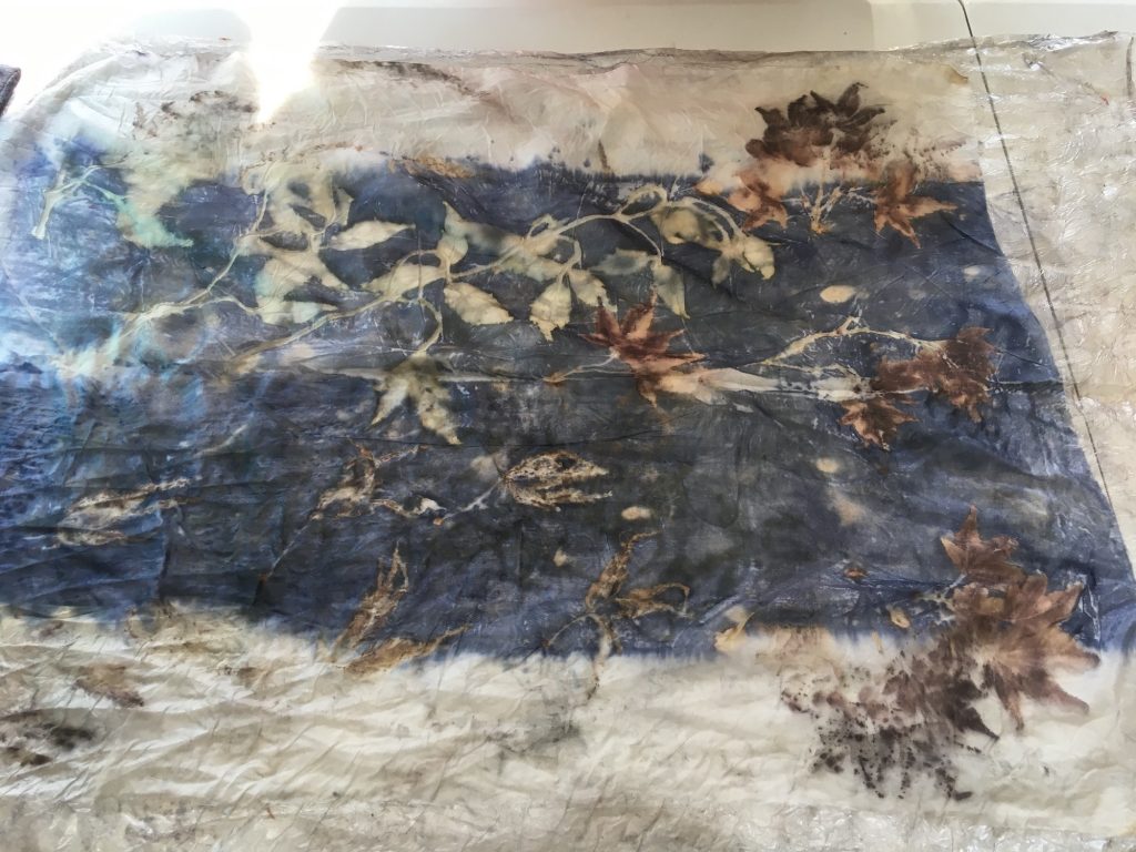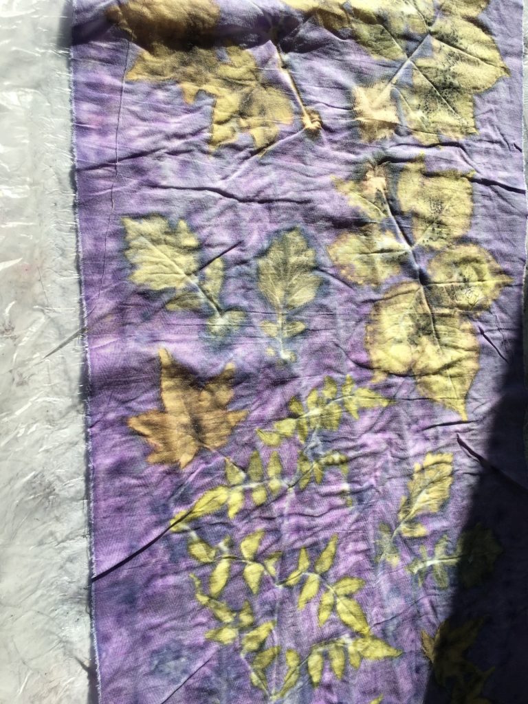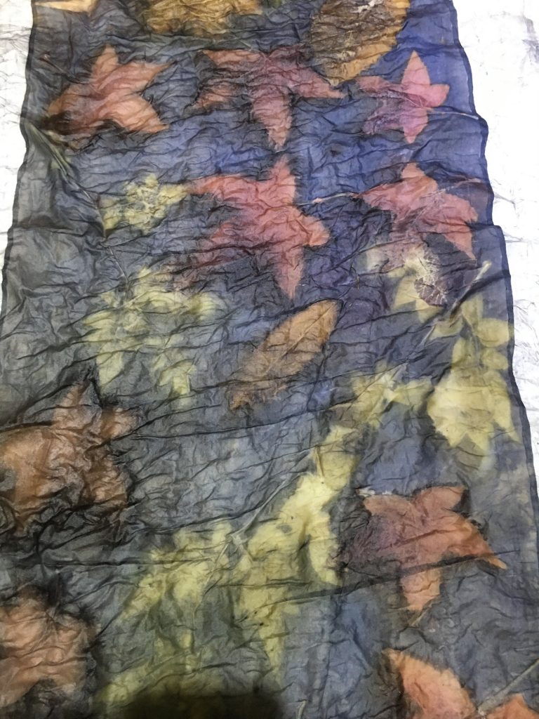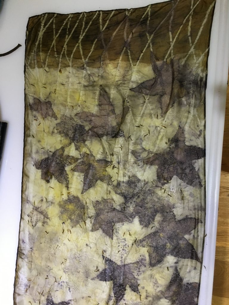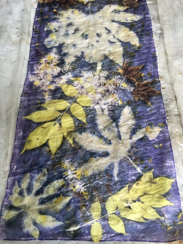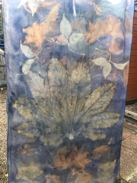 This was my silk scarf part way through the reveal…. logwood blanket with leaves still stuck to it on the left, printed scarf on the right. I was a little disappointed with the eucalyptus leaf in the top centre of the picture, I have previously achieved some lovely orange prints from this tree but not today.
