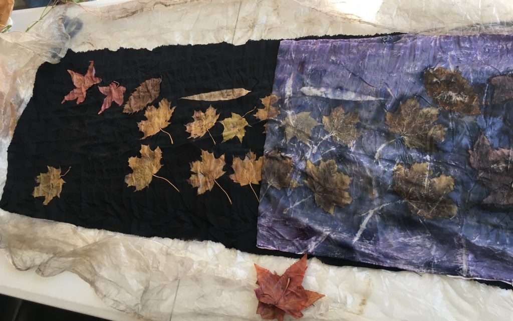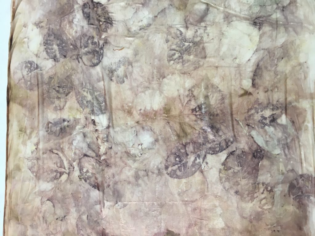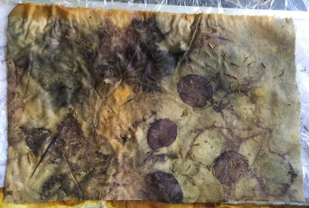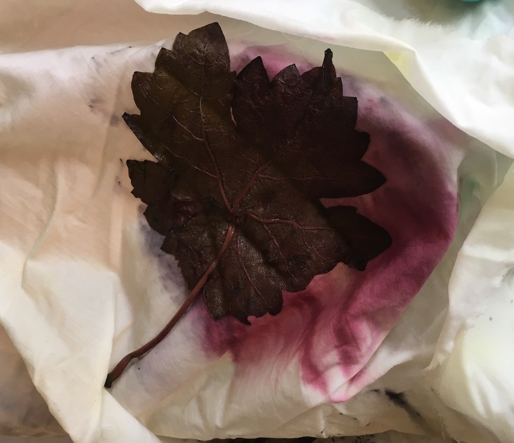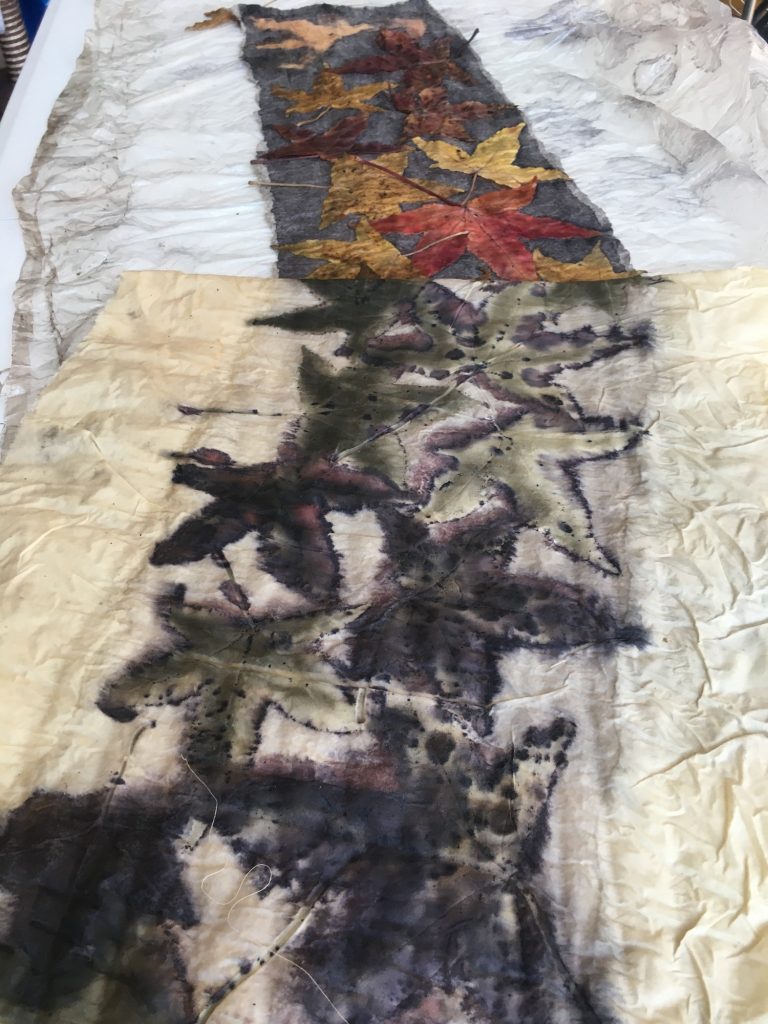 After looking through some of my previous attempts we settled on a logwood carrier blanket for the first attempt. The leaves were dipped in iron water before laying on our fabric, covering with the logwood-soaked carrier blanket and steaming. These were our results…