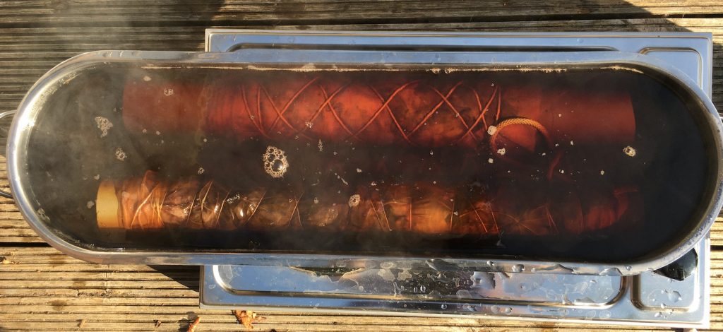 Next we tried a dye bath (as opposed to steaming our bundles), we mixed a sweet-smelling concoction of eucalyptus bark and red onion skins: