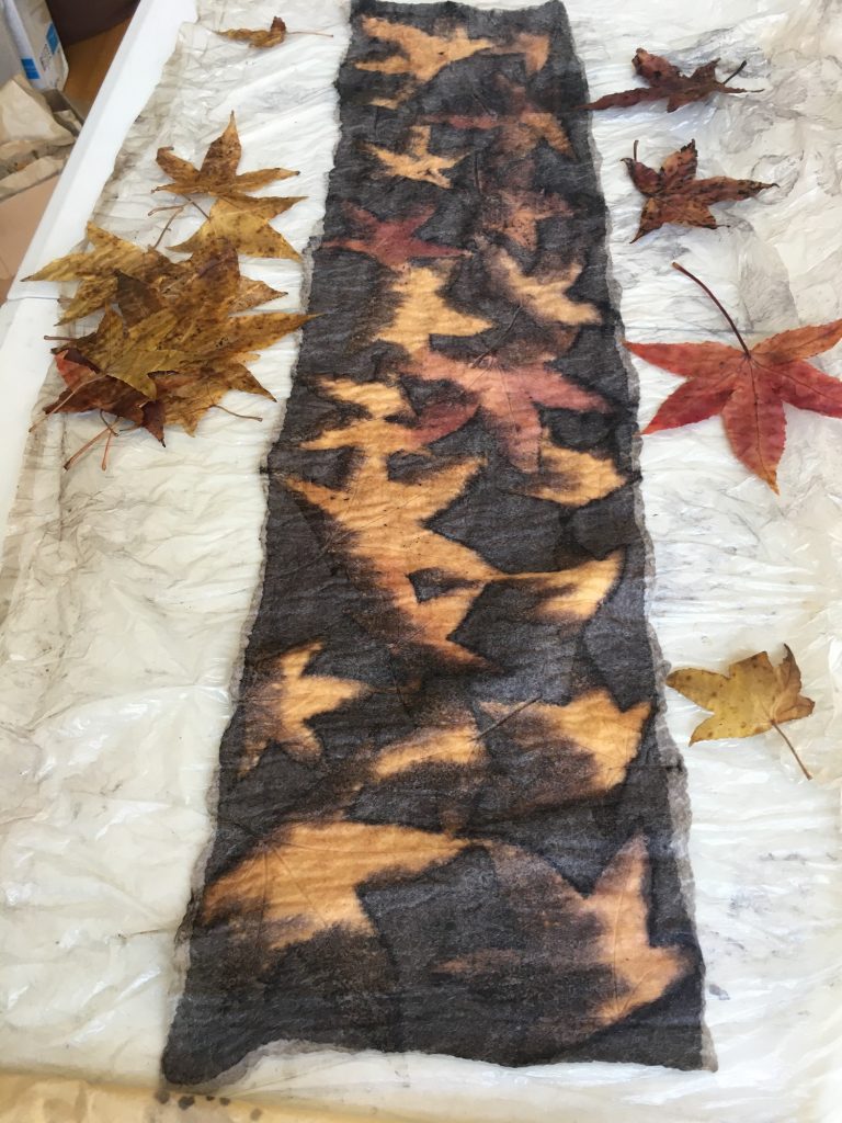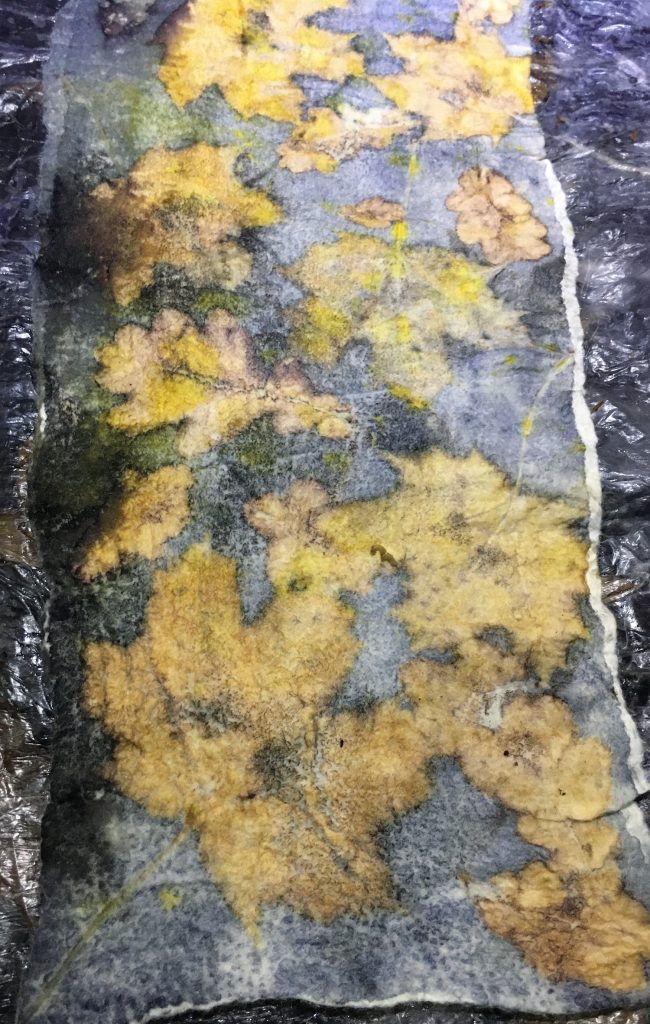 I included a nunofelted scarf on the other side of this dye blanket too and was pleased with the colours from the sycamore and oak leaves, I think the yellows work beautifully next to the blue-grey background: