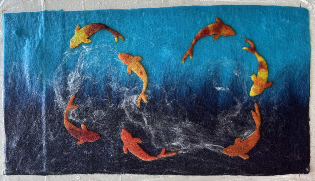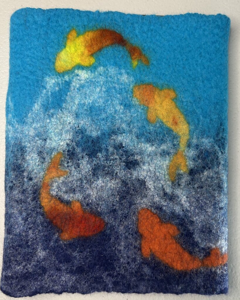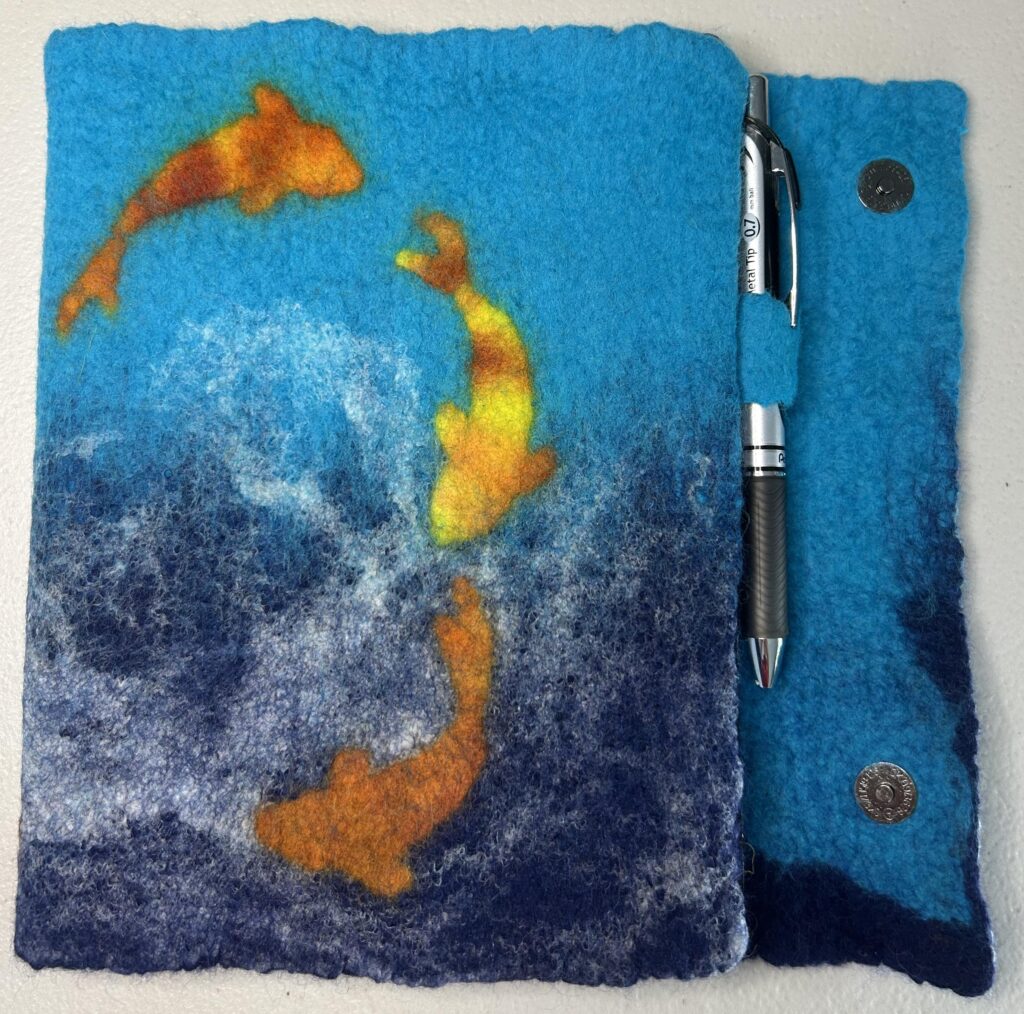 Finally a bit of felting fun, a new journal cover. When I started laying out the wool for this I was planning to cover it with yarn in a grid pattern but just as I was about to start laying out the yarns it screamed, “WATER!”. So I rummaged in my bag of prefelt scraps and found some space-dyed orange and yellow pieces. Perfect for fish! A couple of white silk hankies to emulate splashing water / surf et voila!