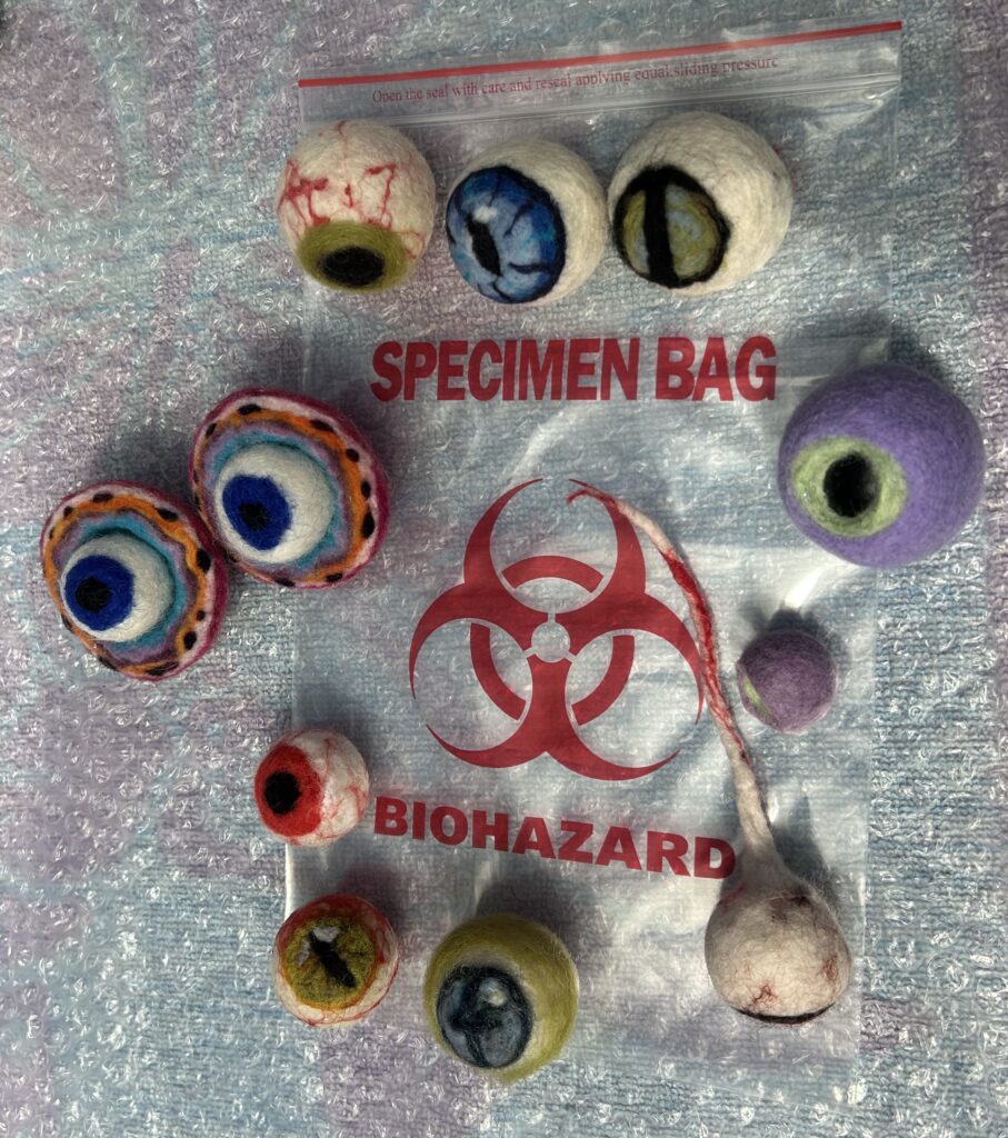 A few felty friends and I had a play date just before Halloween where we made felted eyeballs using a variety of different techniques (felting around glass marbles, polystyrene balls and making solid wool balls).