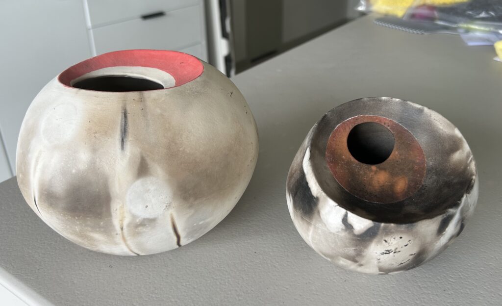 These were my pots, the red / orange rings around the top were from underglazes I painted on before firing, the browns, greys and blacks were from the materials added to the fire. I have started waxing the one on the right, which has intensified some of the colours and it’s growing on me but the one on the left I think will be re-fired with some more traditional glazes.