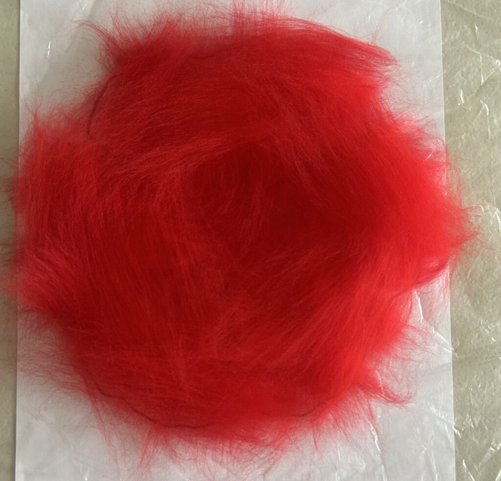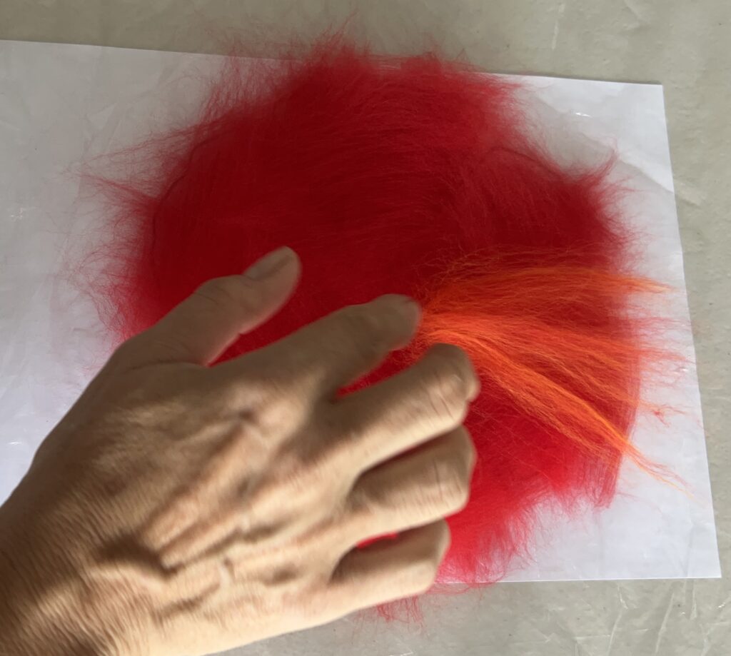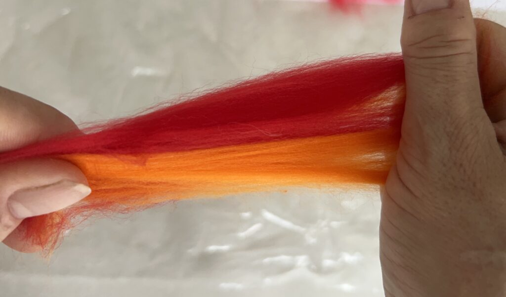 To “finger blend” two colours, lay a tuft of each colour on top of the other. Pinch at both ends and pull your hands apart.