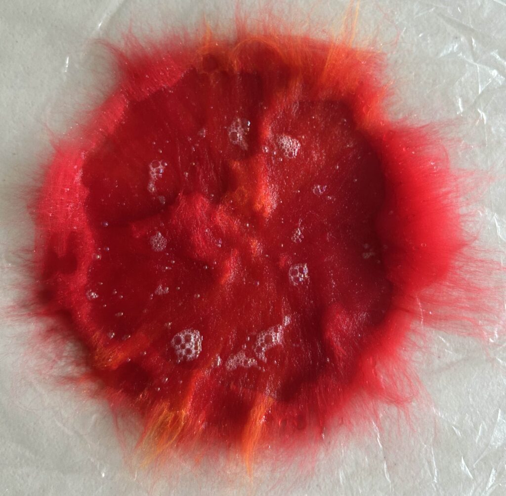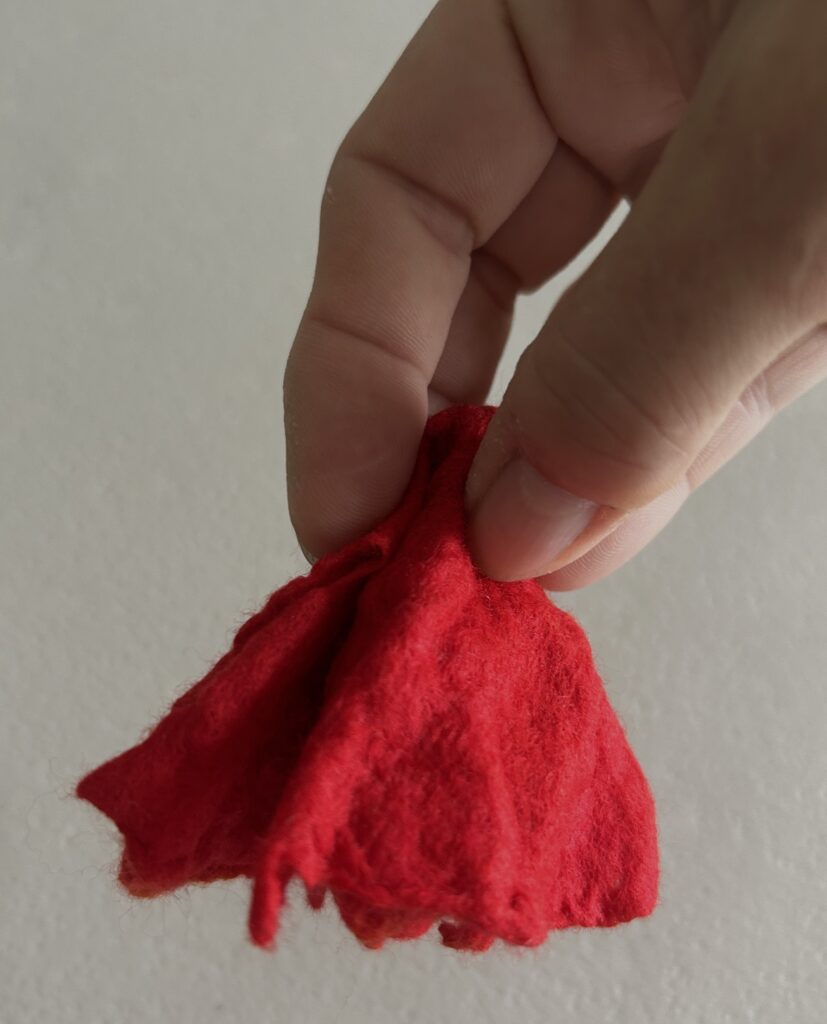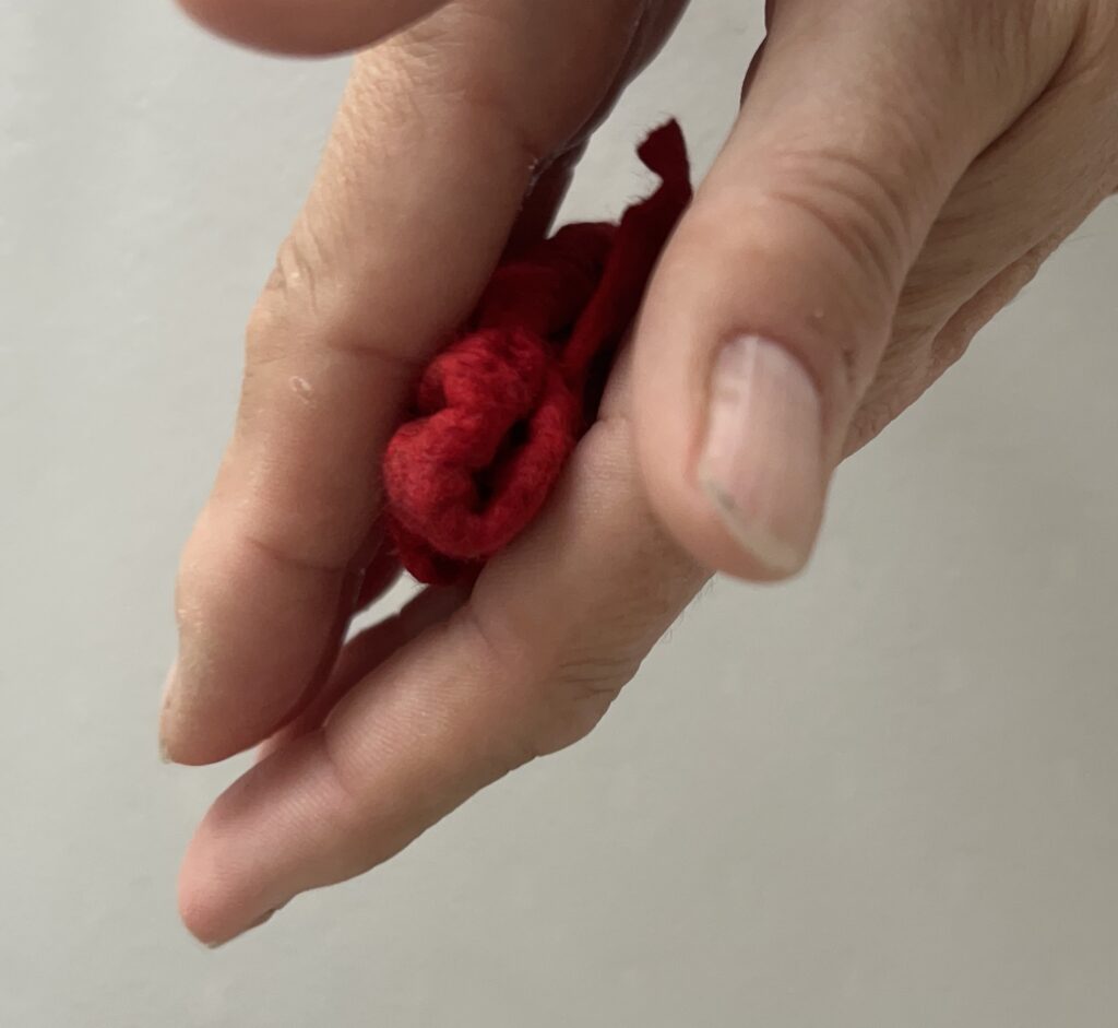 10 – Felt your flower to the prefelt stage using your preferred method; rubbing, rolling, “sanding”, kneading etc. When you do the pinch test the fibres should be holding together:
