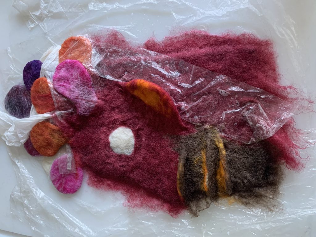 I applied quite a lot of silk to the “spike proteins” expecting them to add a dash of colour but the fuzzy nature of Black Welsh wool has all but engulfed them